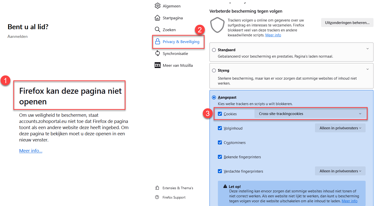 Als je Firefox gebruikt, komt het voor dat je het inlogscherm niet ziet. Je kunt dit aanpassen door naar "Instellingen" te gaan en te klikken op "Privacy & Beveiliging" en dan aangepaste instellingen voor cookies te kiezen, zoals hieronder in het voorbeeld is aangegeven.