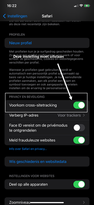 - De makkelijkste oplossing is als je bijvoorbeeld met een iPhone/iPad probeert in te loggen via Safari. Om het probleem te voorkomen, moet je bij instellingen de optie "voorkom cross-site tracking" uitzetten (zie afbeelding van iPhone). Als je die uitzet en dan de registratie afmaakt, dan werkt activatie wel. Je kunt deze optie daarna weer aanzetten, omdat je dan wel gewoon kunt inloggen.